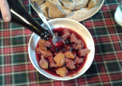 Ingredienti: mezzo pane nero (un tempo di segale) tagliato a fette alte circa 1 cm – circa ½ litro di buon vino rosso – 50 g di burro – 100 g di zucchero (o più se lo desiderate più dolce).